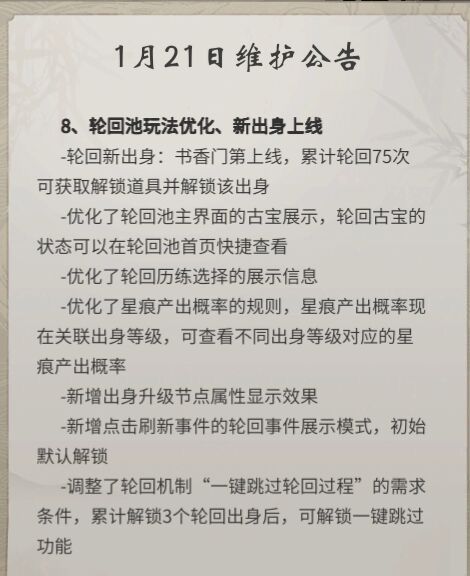 -调整了轮回机制“一键跳过轮回过程”的需求条件,累计解锁3个轮回出身后,可解锁一键跳过功能