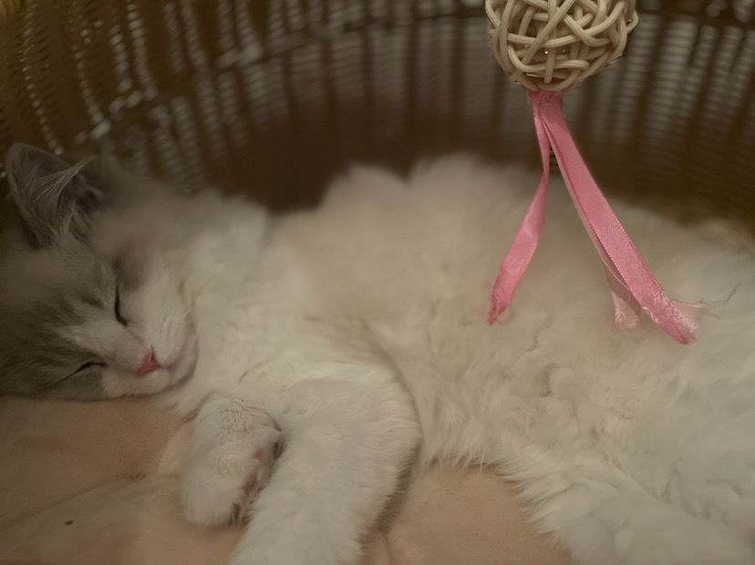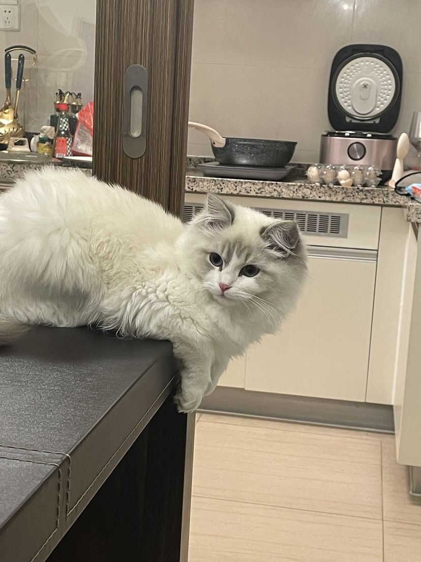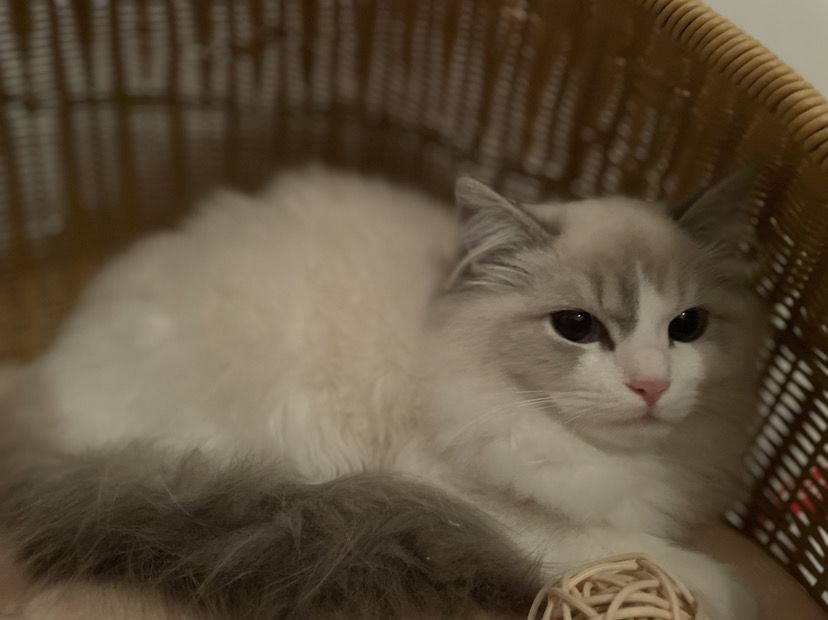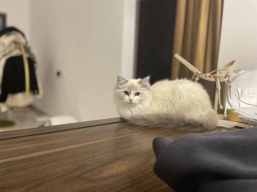 它是我麻麻从猫舍里买回来哒 因为他们买的时候我也不在 也没什么时间去看它 所以一直等到了它4个月多的时候我才来看它 一开始我问我爸妈是啥品种 他们就是不肯告诉我 要等我来看就知道啦 然后我看了是一只小小的布偶 它的爪子好小 就只有我一个手指头那么大啦
