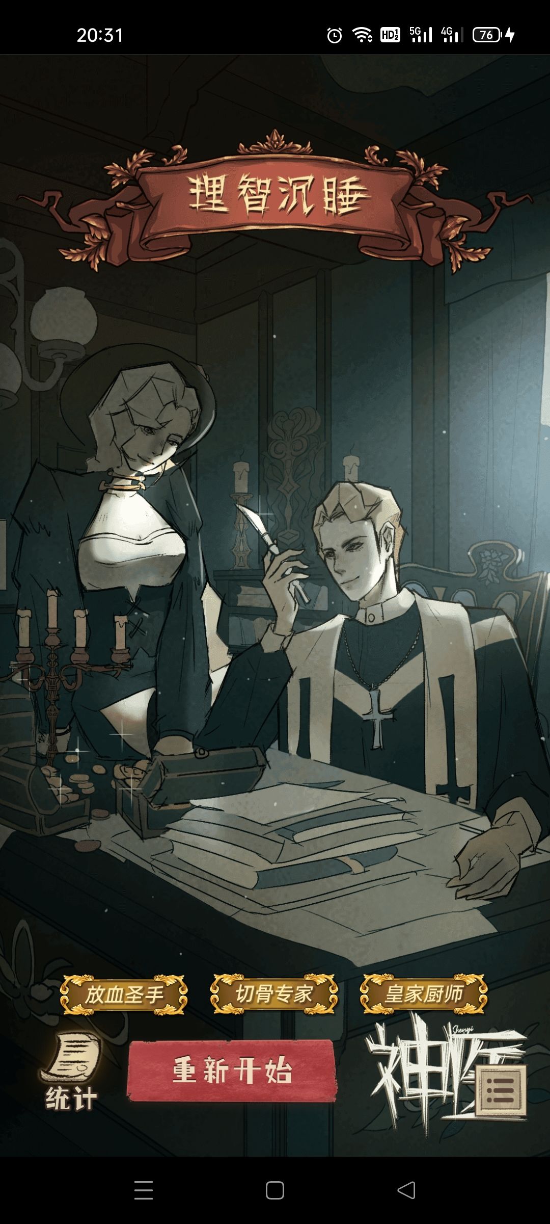 有点惭愧,最后我打出了“理智沉睡”的结局。最后面见国王时虽然阻止了他饮酒,但后来强效镇痛和放血疗法我却没有拒绝,后来事情的发展便愈发不受我的控制,我被死死的绑在“维护传统医学荣耀”的金玉在外的船上,做着以前我不认同的事,朋友,应该算吧,安德烈,与我决裂,我逐渐变成自己所讨厌的“权威”的样子。