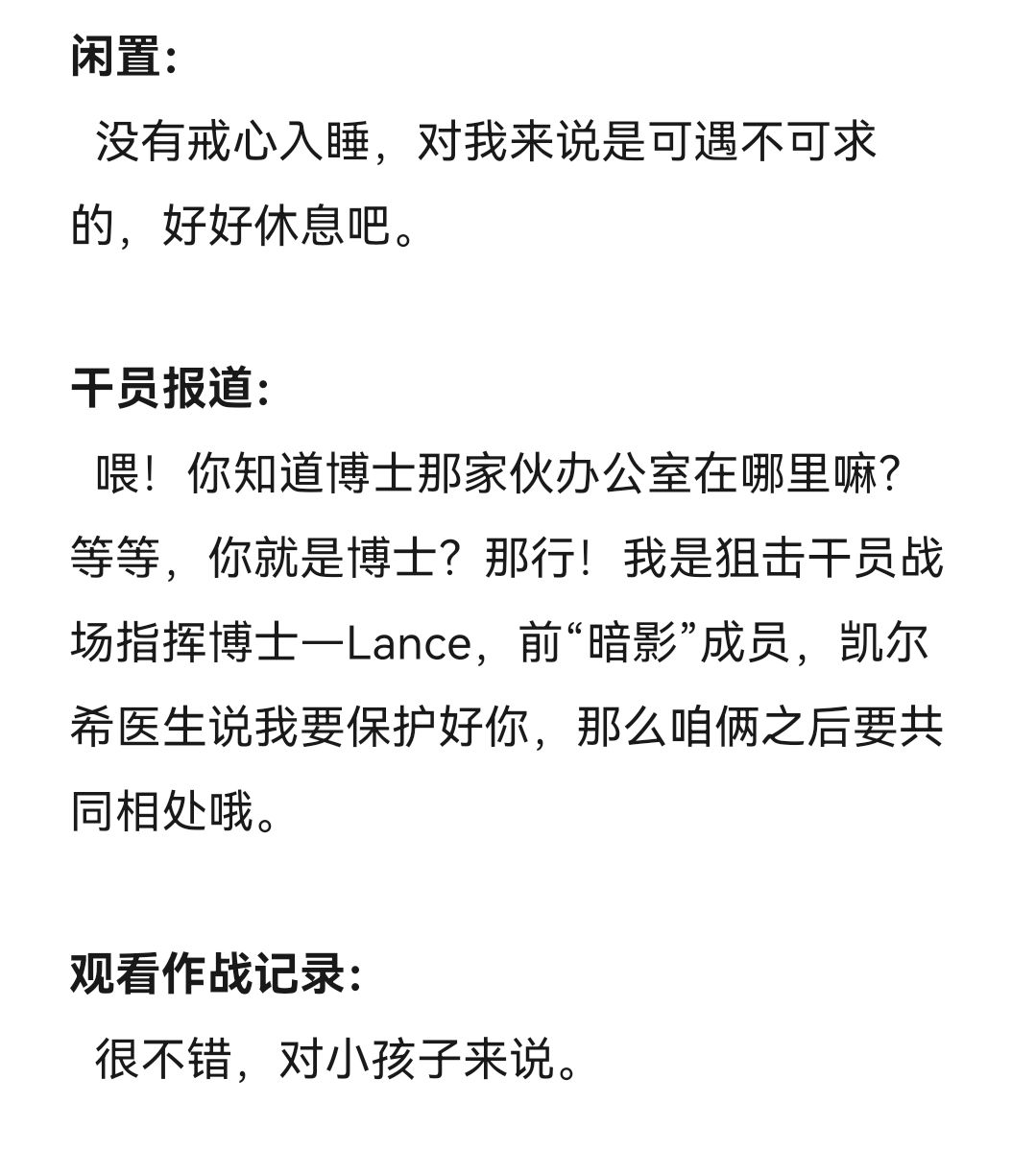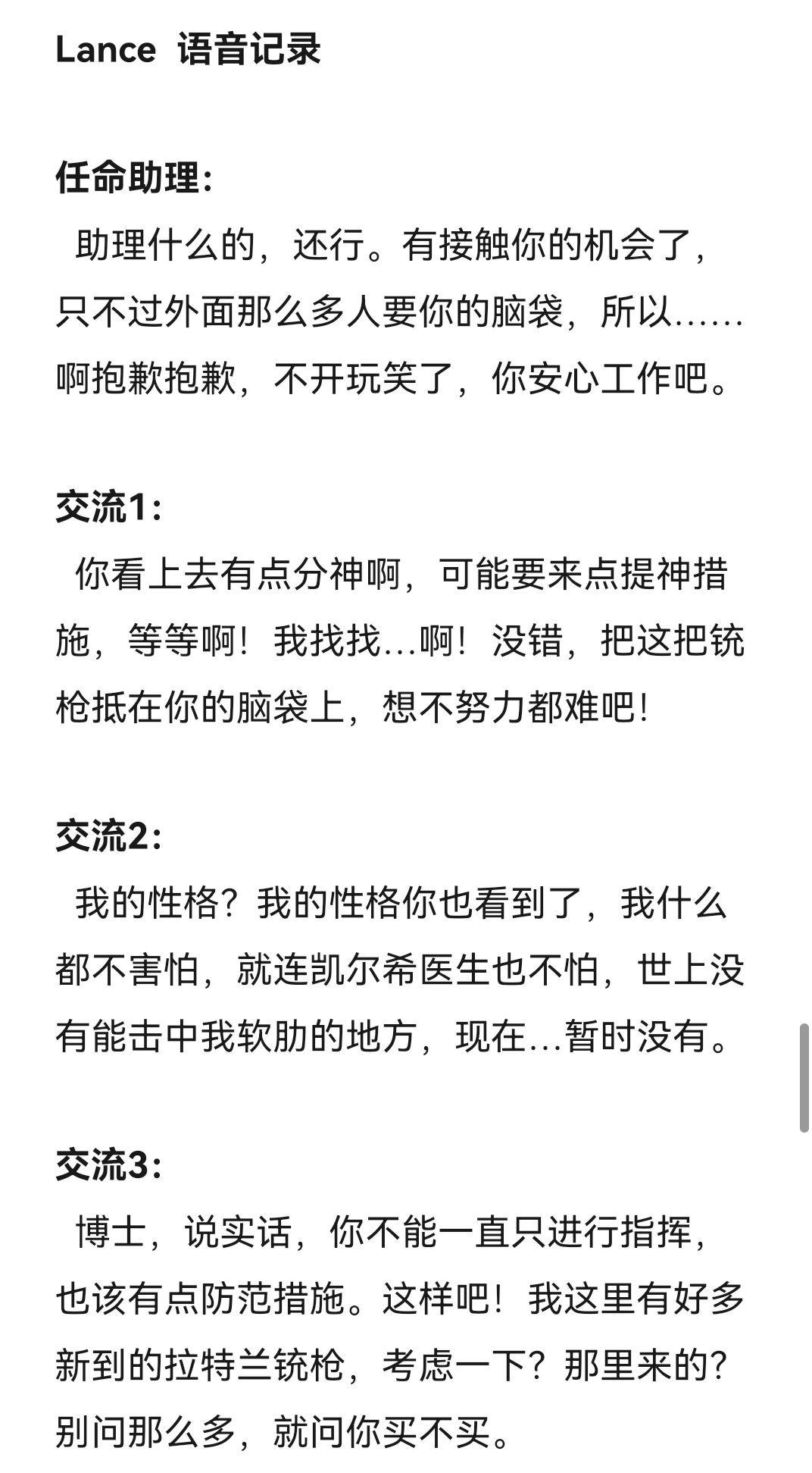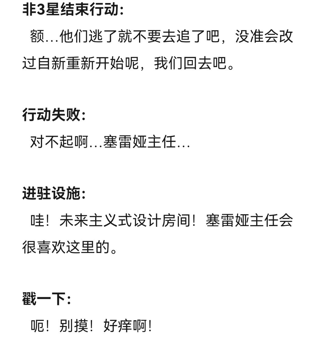 然后……提一嘴,写这种语音记录真的比我想象中还要困难,通过对话来表现出角色的特点、性格、爱好等确实困难。但总算完成了,这次对我来说也是一个新的尝试,我也很期待下部作品依然能让各位喜欢。