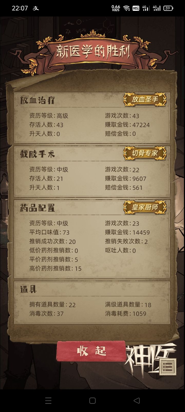 成功打出新医学的胜利,老实说这游戏给我的心理体验并不是很好,明明知道怎么做是对的,却一次又一次昧着良心挣钱,前期知识没突破还好,知识更新了就有些难受了……