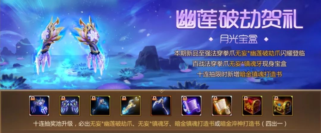 除了以上的道具之外,还能领取月之匙十连抽有机会获得无妄*幽莲破劫爪,神*九尾狐仙等顶级装备。