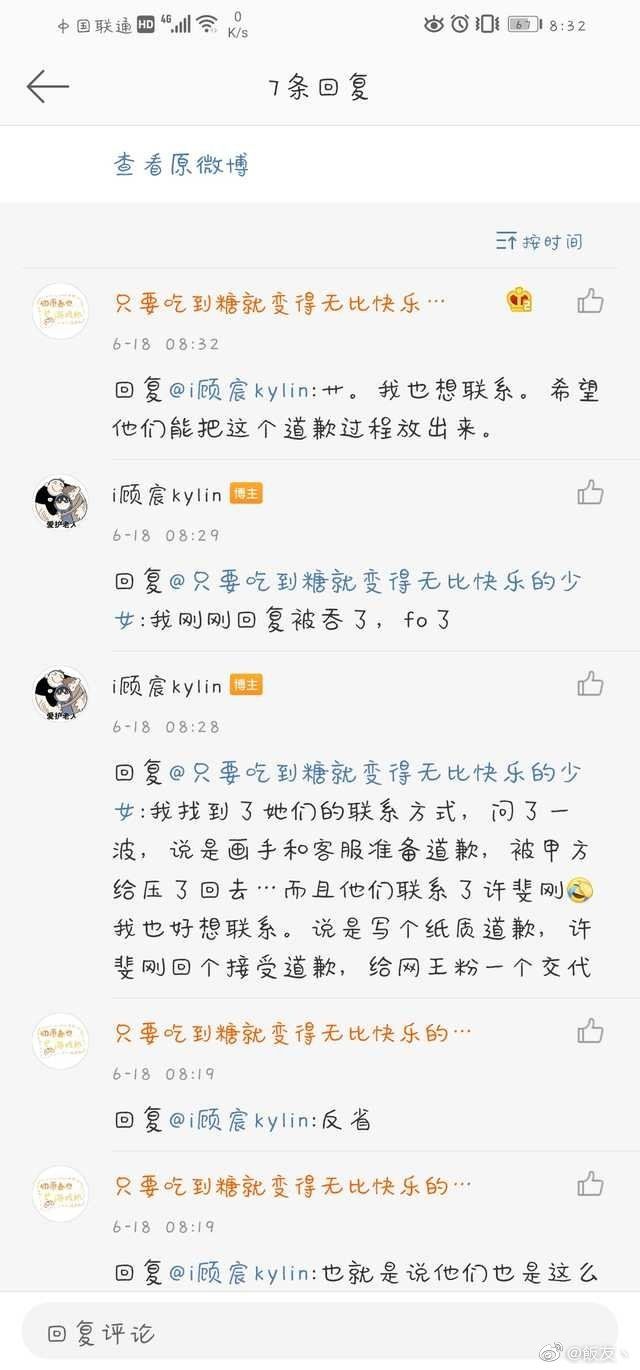 早上风平浪静,一个落樱/栖木的妹子跟我们说她联系到客服说客服和画师是想道歉的,但是被甲方压下了,并提到说要跟日方联系,跟许斐刚道歉,我们信了,然后就坐等。(p6)