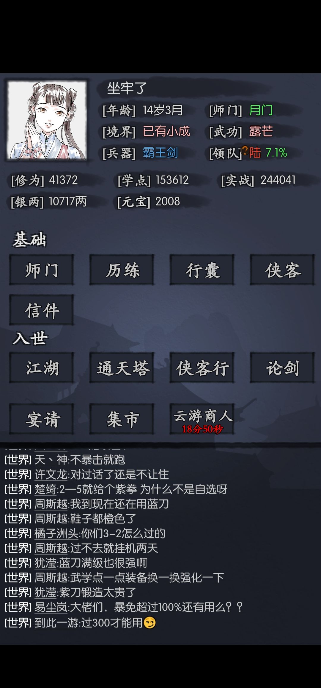2. 贡献开启,直接买【剑法修习录】、【剑法精研录】、【月门剑法秘籍】,把主角的【飞燕还巢】堆到9级或者10级。