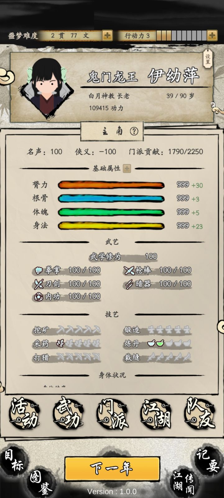 附12武功10行动力40岁玄铁剑退隐图和屠龙刀神刀斩,速度加成不知道干啥的,感觉没实装,全图跑很欢乐👀