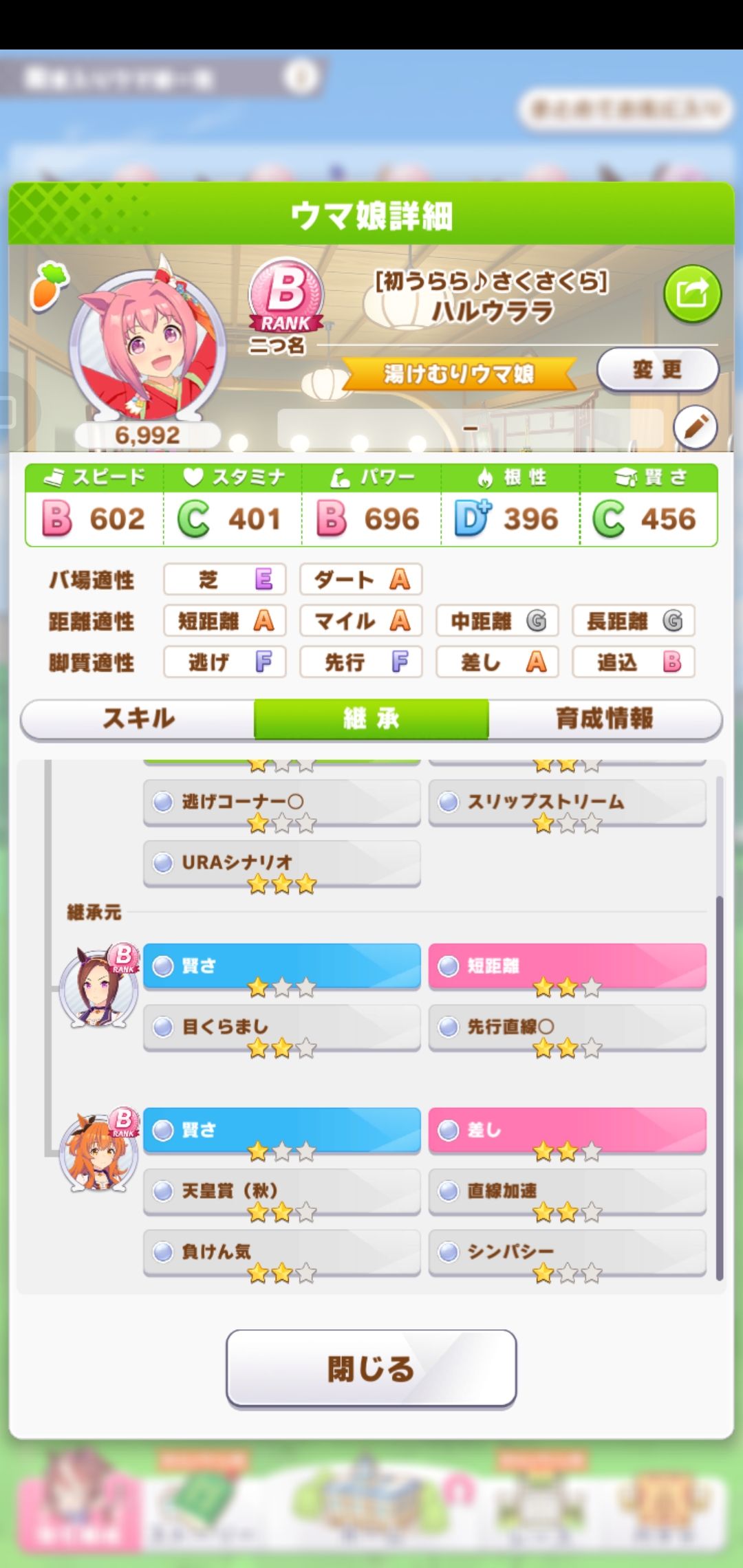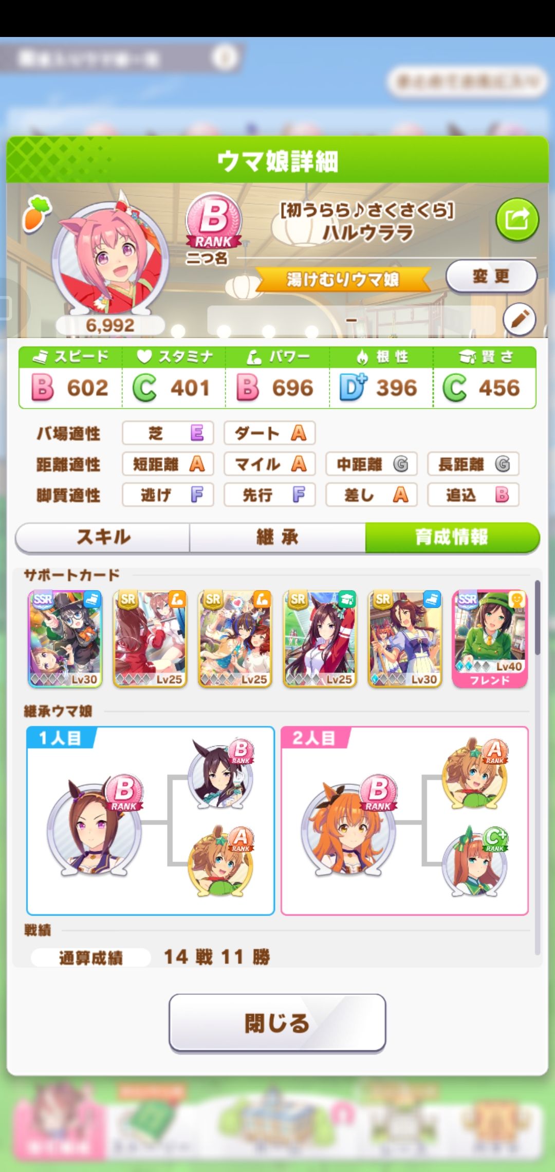 由于第一次抽到新春乌拉拉,且网上关于新春乌拉拉的攻略太少了。入坑也晚,就没有妹妹头和东海帝皇的ssr支援卡(是真的穷:-|)按照网上给的原乌拉拉攻略,第一次养到了B。这是第一次养乌拉拉的技能、因子以及配卡。