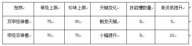 当宠物集齐印记只需合成蜕变界面提示的蜕变道具并使用,即可使宠物完成蜕变,将资质提升至三万年水平。神兽同样可以蜕变进化,与非神兽宠物蜕变方式一样。
