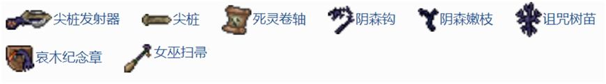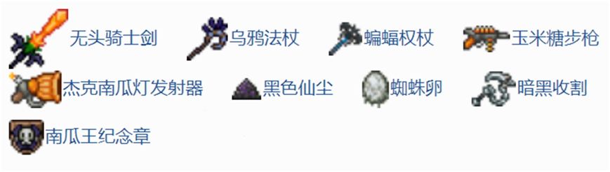 在两个boss的掉落物中,有几件物品可以加以注意:哀木掉落的女巫扫帚和死灵卷轴,来自南瓜王的暗黑收割。这几件物品较为强力/重要,其他物品各位泰拉人可以自己去尝试一下。