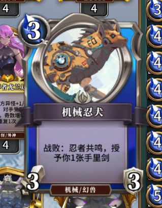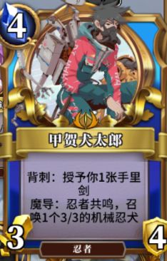 简而言之,只要犬太郎不死,就可以疯狂铺场忍犬,同时用手里剑给对面刮痧。忍犬在对面没清场卡的情况下能打出很好的效果,毕竟犬是可以一直召唤的,可以有效消耗对面的生物卡(记得保护住犬太狼QWQ),利用手里剑多多走位!