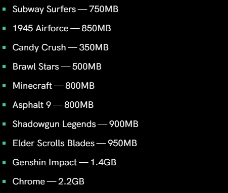 他使用的应用及游戏如上所示,少则占用350MB,多则占用2GB内存,Chrome在安卓手机上也是吃内存大户了,能占到2.2GB内存,比3D游戏还夸张。