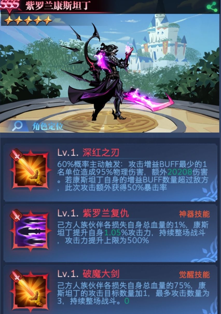 ①:他的神器和觉醒技能都与队友的血量相关,也就是队友越惨,坦丁越强。且该影响为永久影响,就算队友血量回满,坦丁被驱散,依旧有效。