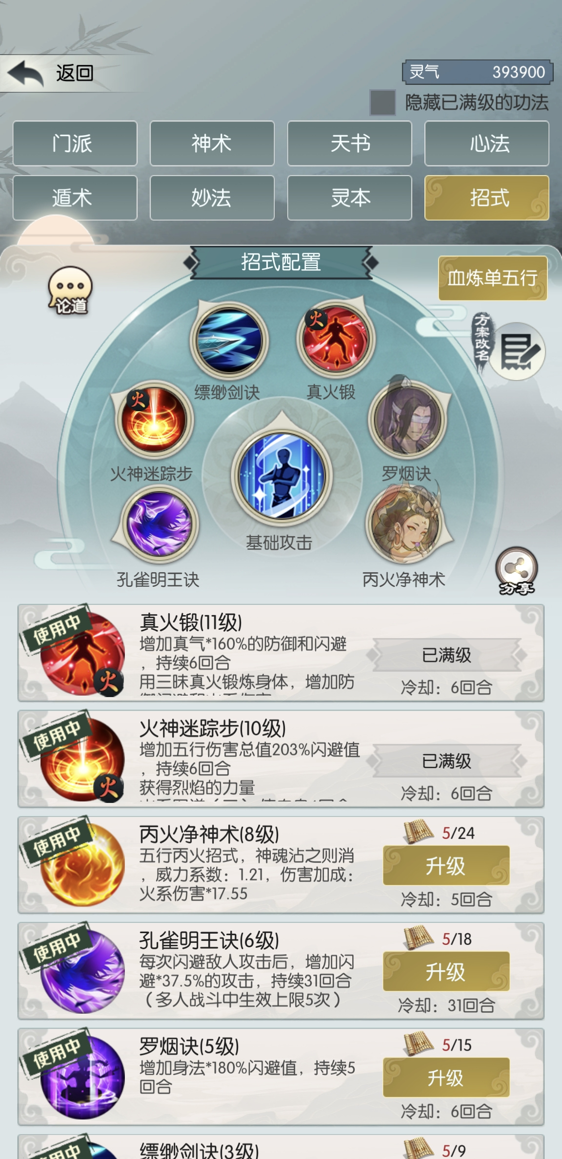 因为方圆的缘故,我们都是可以扛到第六下的,而这时候的血量正好在这个区间;我们偷图一般都是前面加一堆增益最后输出,完美的触发了这个天赋;灵兽招式也选择buff类,加防御加伤害都可以,我本人带了一个舞火术(加火系伤害),这就又触发了3+1次伤害加成(舞火术本身是伤害加成技能,作为增益效果他同时又触发了六道无我剑);最后再加上图谱的增益效果,在这环环相加之下我们不需要特别高的属性就可以打出爆炸伤害。