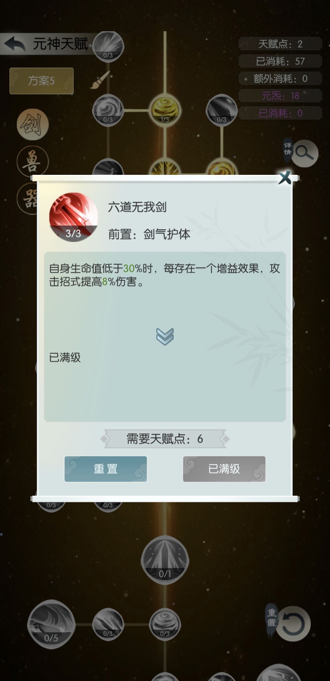 核心思路就是这个六道无我剑(一般二三千年的道友打到东极岛都是可以点到这里的)。生命值低于百分之三十,每存在一个增益效果,攻击招式就可以提高百分之八的伤害。