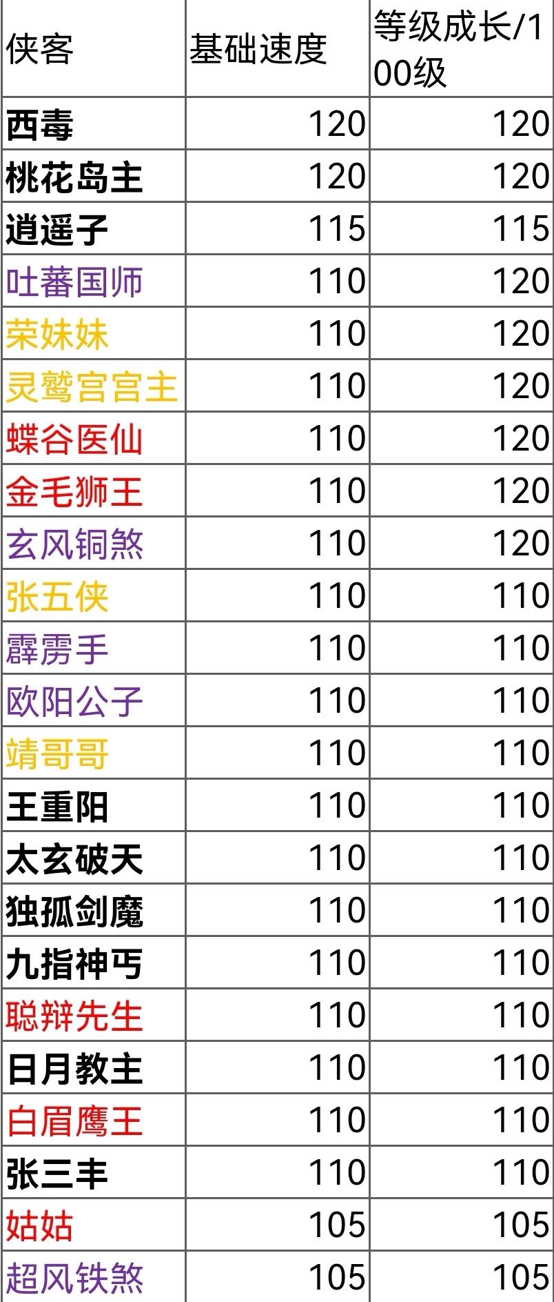 接触过一阵游戏的玩家都会有一种感觉,就是不论玩什么阵容,都绕不开速度的问题,速度可以说是及其重要的,对于战局起决定性作用的属性。所以我对游戏内的侠客速度做了个大致统计,数据依靠个人实践,有个别隐士侠客实在无法得知,数据为其它玩家告知。共计侠客本身初始速度以及成长速度,如统计数据有误欢迎指正。