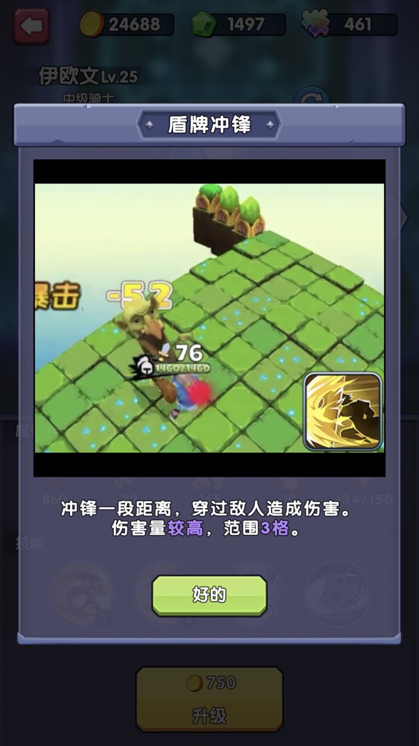 第二技能为盾牌冲锋,这个技能可以让骑士向前位移一段距离,值得一提的是在位移的过程中,骑士是无敌的,用这个技能可以轻松的跨越障碍,伤害性地面,或者战斗力远大于角色的敌人。而解锁这个技能的条件是要收集“全身甲”这个材料,这个材料最容易的获取方式就是新手关卡的第9关,尽量的击杀敌人,或者参与扫荡都可以很快获得该材料。