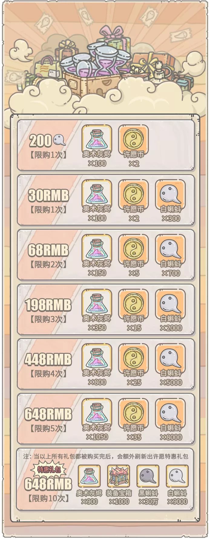 活动期间,贩售机将出现福利礼包,每天5点刷新,售价1白蝌蚪。内容为:白蝌蚪×20、许愿币×1、奥术灰烬×100
