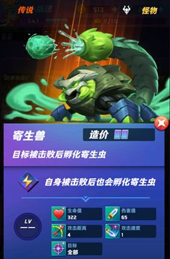 寄生兽,在联赛等级到达5级可以解锁的传说级卡牌。单纯以面板来看,它的生命、伤害在远程兵种中并不算太高。但是被它喷吐毒液击杀的单位,并不会直接消失,而是会孵化出一只小小的寄生虫,同时加入己方阵营攻击敌人。再通过商店购买技能升级后,寄生兽本身在被击败时也会孵化出寄生虫继续战斗。