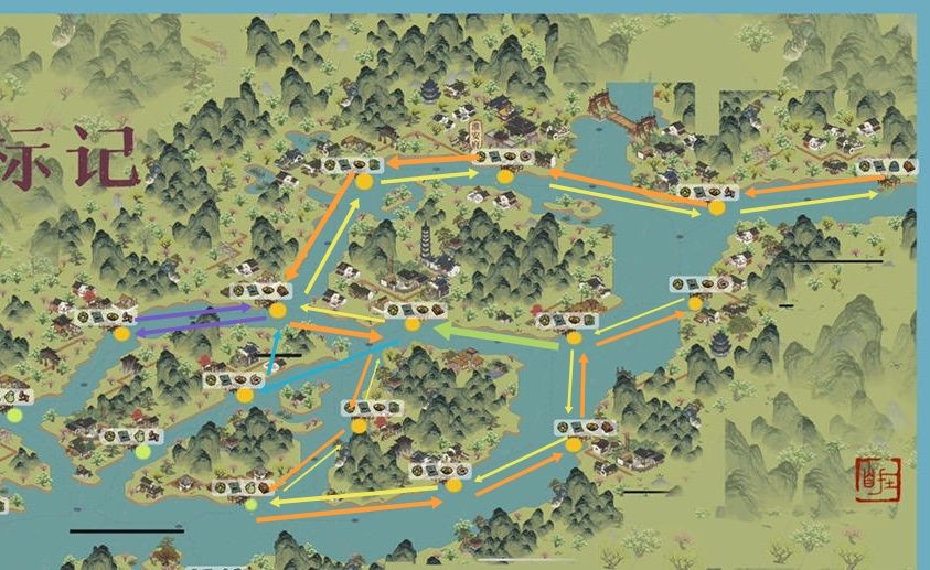 理想情况是从右上角出发,沿着橙色路线,绕两个岛逆时针一圈。