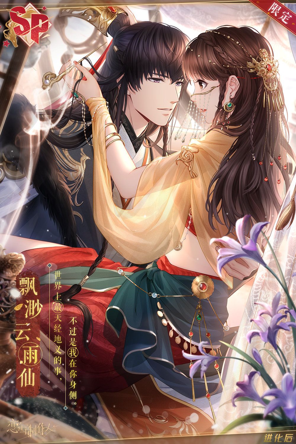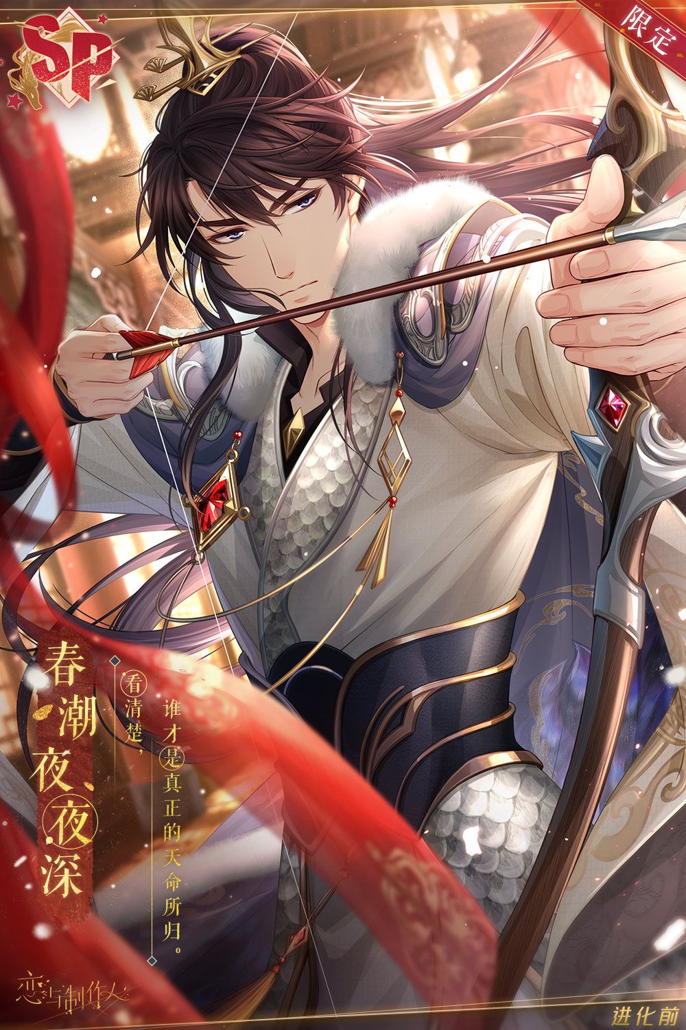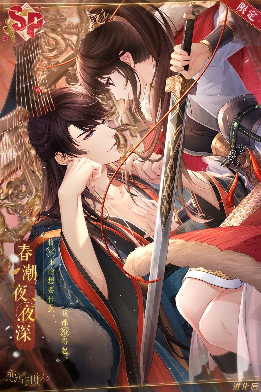 羁绊培养至4阶(解锁另一面)后,即可在羁绊奖励界面领取对应男主SP【去见他】进阶后【帝王华服】。