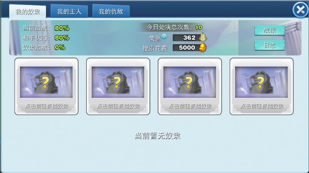 奴隶状态(奴役他人):玩家处在奴隶状态,同时正在奴役他人,失去正常的产量加成的同时,享受奴隶提供的产量加成;