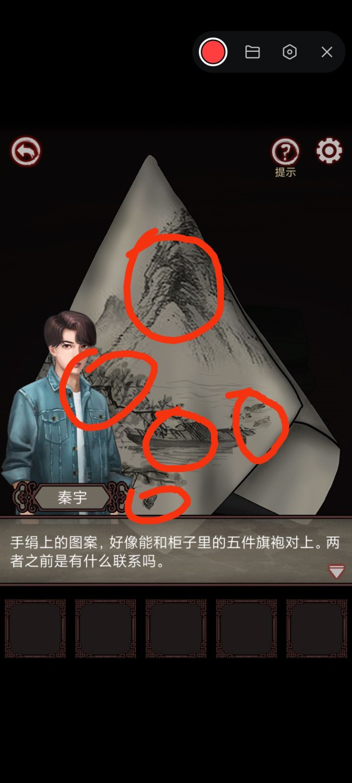 打开柜子注意看手帕对应旗袍,我画红圈⭕地方,有山,船,鸳鸯,蝴蝶,树,再看旗袍上图案来调节,忘记说了,注意看剧情对话,他说的话也是线索,大家一定要看剧情对话,暗藏线索,不要嫌剧情对话啰嗦,