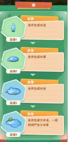 首先,让我们请出今天的第一位嘉宾——可可爱爱的水池系列!看看这个圆润的小雨滴,多么可爱惹!森灵王可以在森林里下雨的时候抓住这些可爱的小水滴噢(下雪的时候抓住雪花后等待15秒。雪花就会融化成水滴呢)!小水滴一直合并升级就可以得到水池,水池会自动生成小水草噢!当森灵王合并升级至小湖时,小湖就会自动产出更高级的小水草堆!神马?有小伙伴问我水草堆是干嘛的?嘻嘻~小水草堆是可以合成菖蒲的,菖蒲里可是藏着梧桐系列的物品等待动物们采集出来哦!而且梧桐系列的道具升级到一定等级就可以直接派动物收获出木材耶!对了对了,小日月偷偷告诉大家,记得给水池周围留出足够的空地让水草们自由生长哦,不然水草们可能会因为土地被占而长不出来了呢┭┮﹏┭┮!