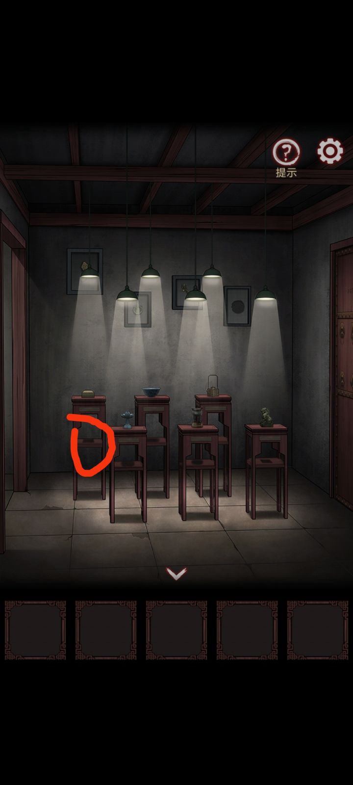 解开墙上,到另一个位置把灯打开注意看下面图案,我用红圈位置,不是要你看椅子最下面,是看有物品地方,灯光印出来影子,看什么形状,对应门上五个,忘记说了注意看门上从古至今