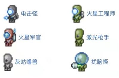 ③火星暴乱事件boss!事件到百分之三十时会概率刷新,到百分之五十时刷新概率会大大提升。它具有穿墙能力,擅长空中战斗。拥有4门有独立血条的炮台,必须先摧毁这4门炮台,才能对飞船本体造成伤害。火星飞碟造成的伤害是整个游戏里第二高的,其伤害可以高过日光塔附近会刷出的星际虫,并仅次于地牢守卫者。