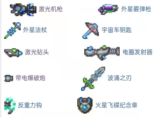 激光钻头是一个钻头类工具,拥有230的强大稿力和+11的超远挖掘距离,深得建筑玩家的心。这里值得一提的是除了火星飞碟,电击怪、火星工程师、火星军官、激光枪手、和灰呼噜兽也有小概率会掉落。