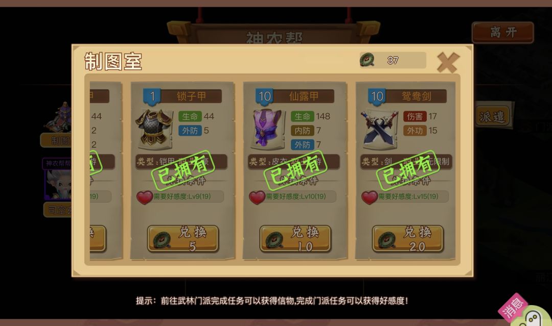 从右下角进入“武林”后,就可以去别的门派活动了。完成押镖等任务,就能提升好感,兑换到更强大的装备图纸。