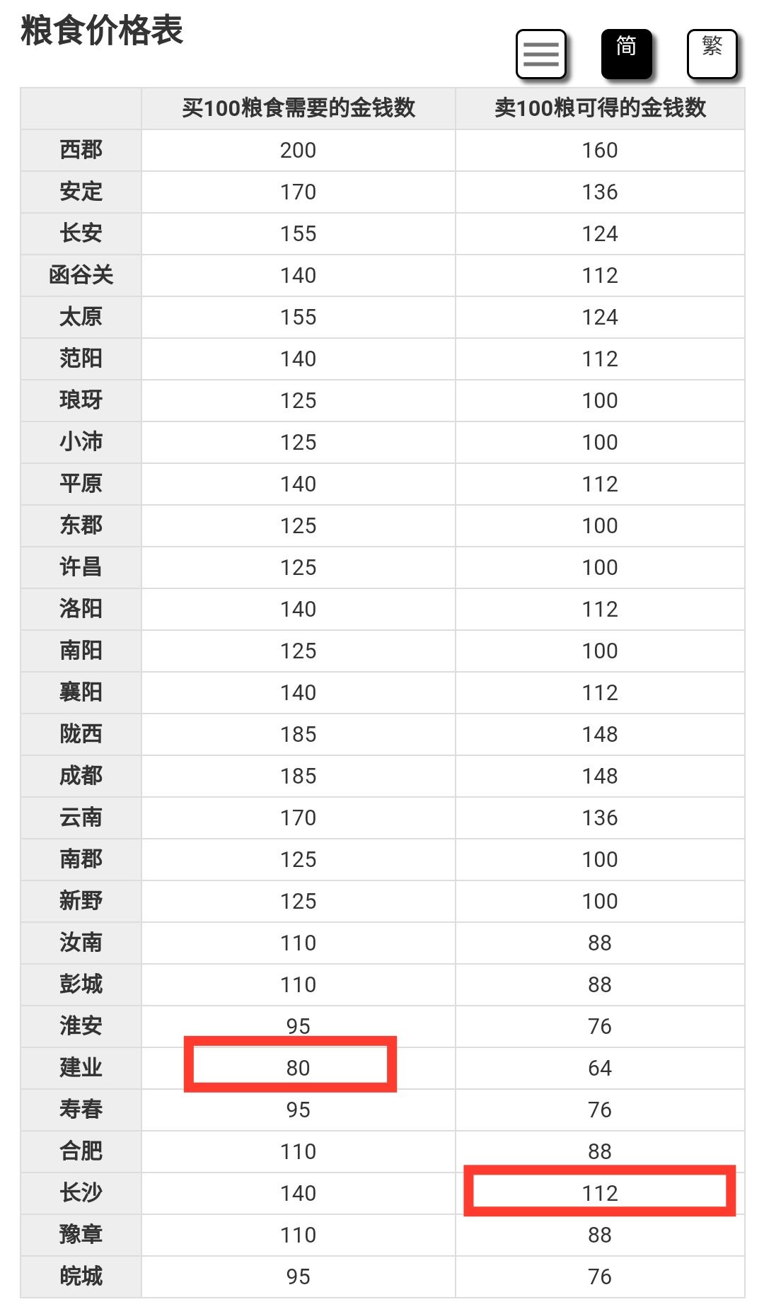 如果初始用1000金钱来做贸易的话 假设极限情况(不治安 屯田 读书)下 四个回合会变成3842 这个钱再进行这种操作之后 每个回合可以净赚1537 这个钱足够一名武将在汝南购买1弓1刀2马2剑(145+195+307×2+39×2=1032)的装备 而如果等到五个回合之后再动手 每个回合能拿到2154的金钱 更是足够文官在汝南购买1弓1火石2马2帅印(145+87+307×2+650×2=2146) 这样下来几个回合会把几个主要人物装备买齐 基本上191年就可以随便统一了