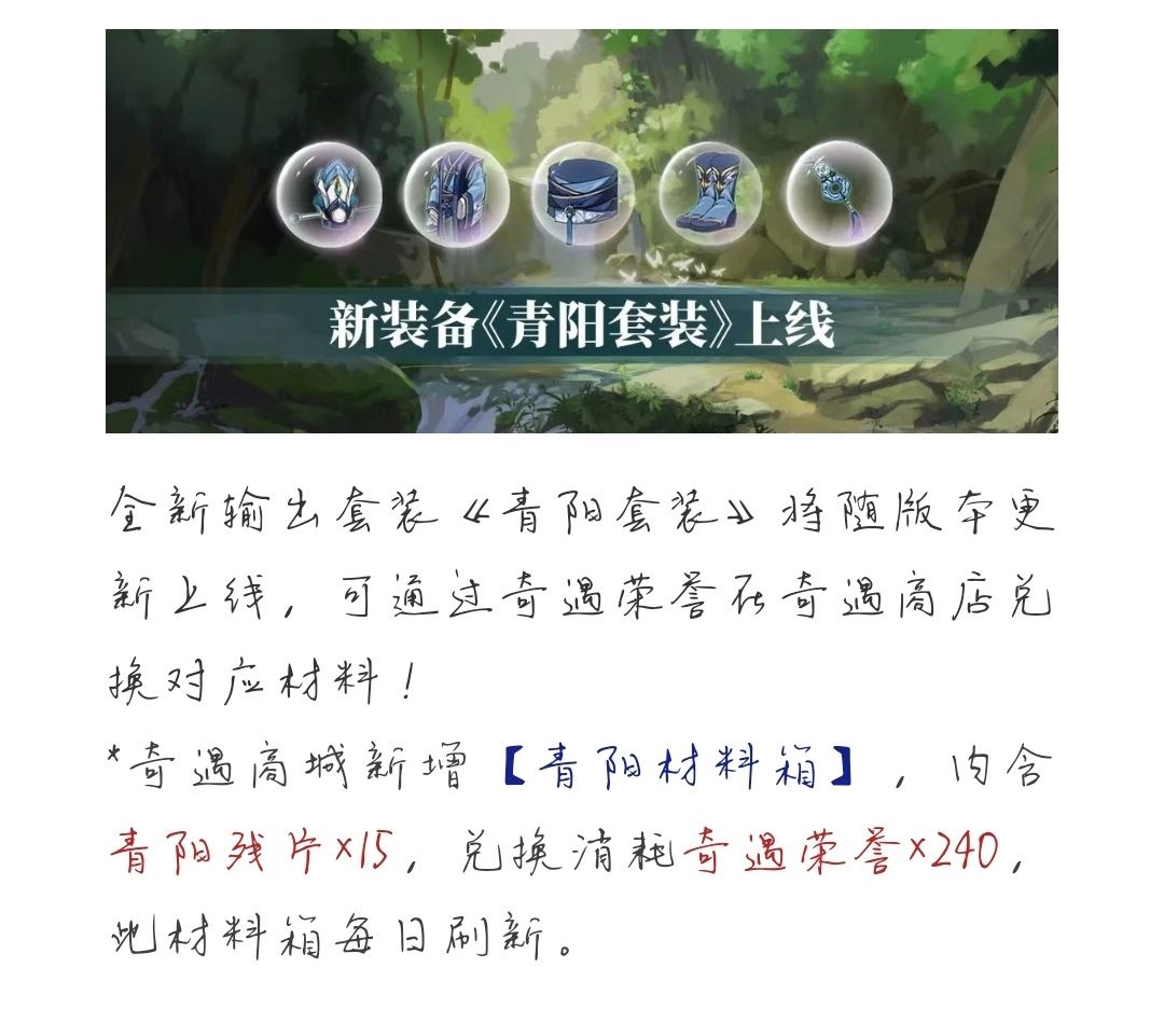 最后是关于新装备青阳套,萌新必买,奇遇商店120(之前是240,改成120了)奇遇币一个,每天刷新