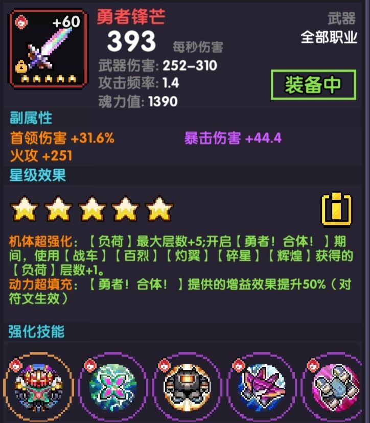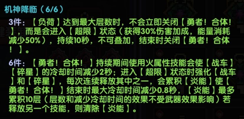 四星效果增加负荷最大层数至20层,每次使用战车、碎星技能负荷层数+3,增加勇者!合体技能收益、大幅缩减进入超限所需时间。