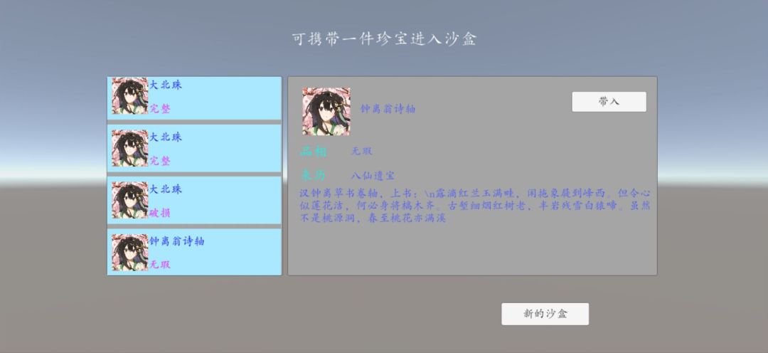 还是从程序白模开始介绍,这2周段段(程序)完成了前后端数据结构的设计、读写结构优化、以及服务器debug。系统功能上做了珍宝的随机和带入带出功能、算卦系统。段段多次求助四爷(程序之神),几经波折才完成了架构。