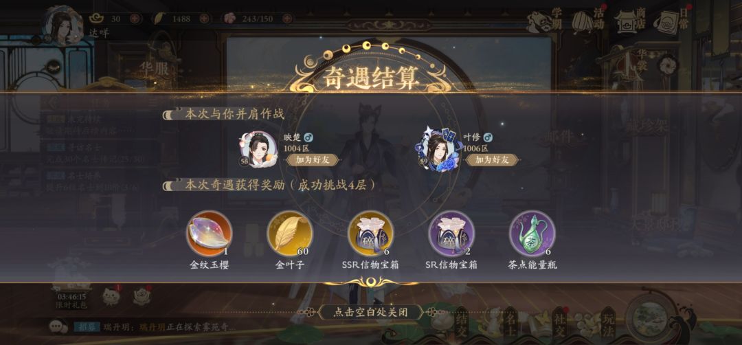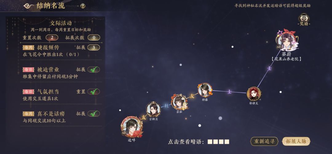 雅集里面每周都可以找神秘人,然后把暗语发给他,有礼包得