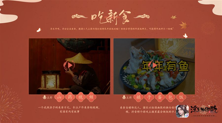 新春将至,贴年画、扫除、拜年,一切都在紧锣密鼓的筹备中,在这即将到来的年度佳节之时,怎么能少的了年夜饭这个项目!在《浮生为卿歌》新春盛典中,阁下将携手与人气主厨一起寻访古法美食,分享自己的年夜饭照片,收获满满幸福感。