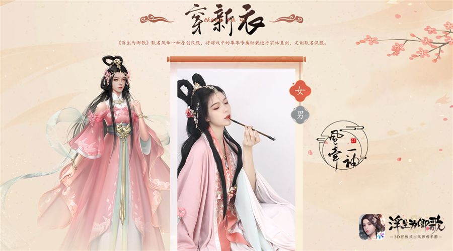 巧裁幡胜试新罗,佳人旧衣换新裳。新年之时,穿新衣就和年夜饭一样,也含送旧迎新之意,《浮生为卿歌》就在此佳期与原创汉服“风牵一袖”达成深度合作,将游戏中独有的唯美时装进行复刻,在遵循唯美视觉效果的同时,搭配细腻的配色及修身的剪裁,视觉上给人浓浓典雅之感,在传统气息浓郁的春节再添一丝精致与唯美!