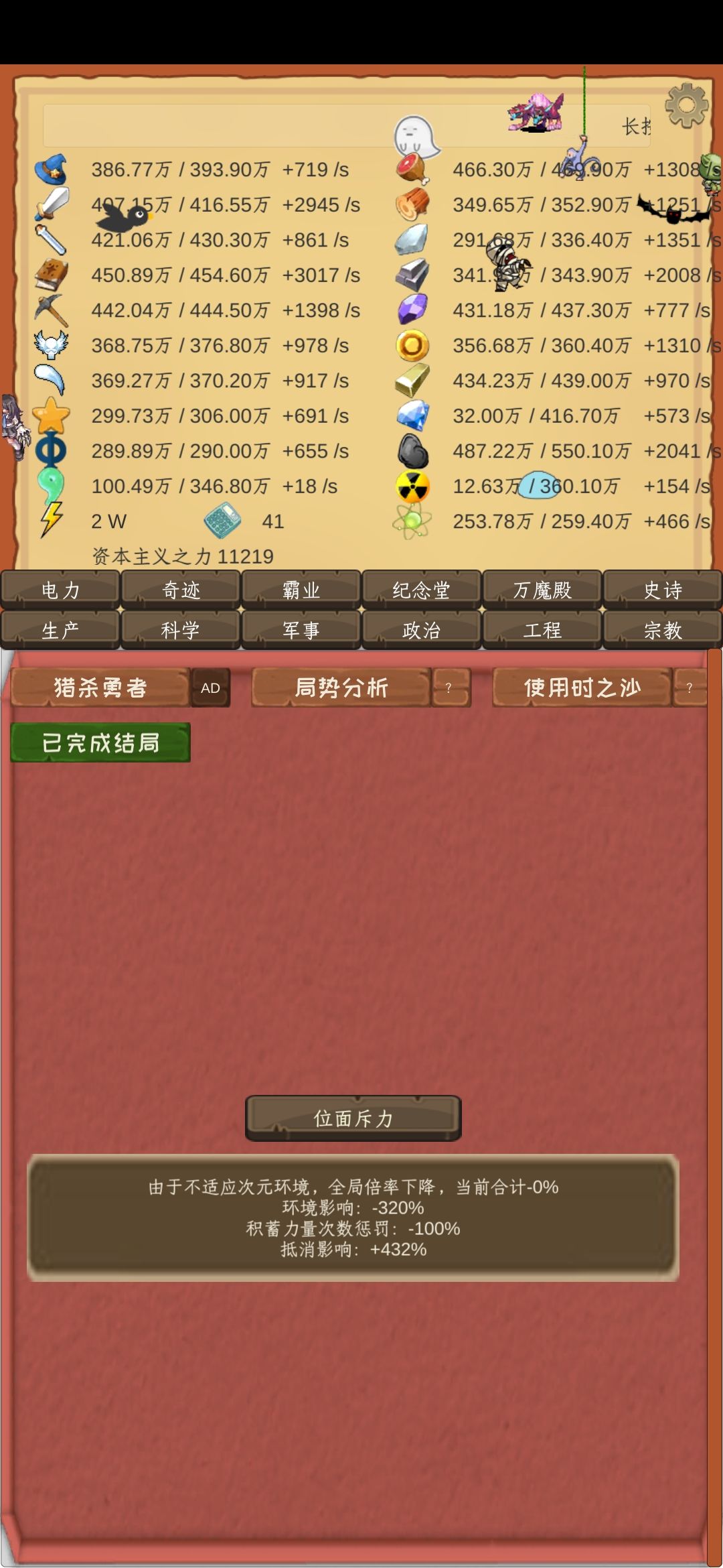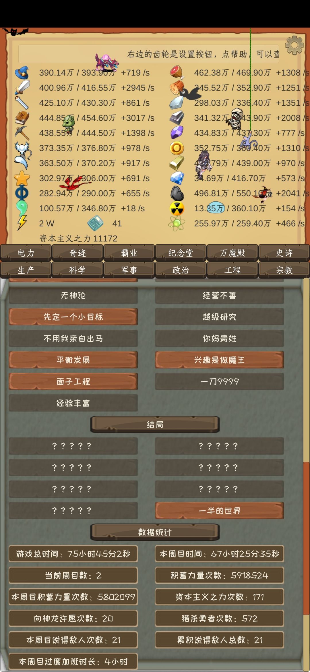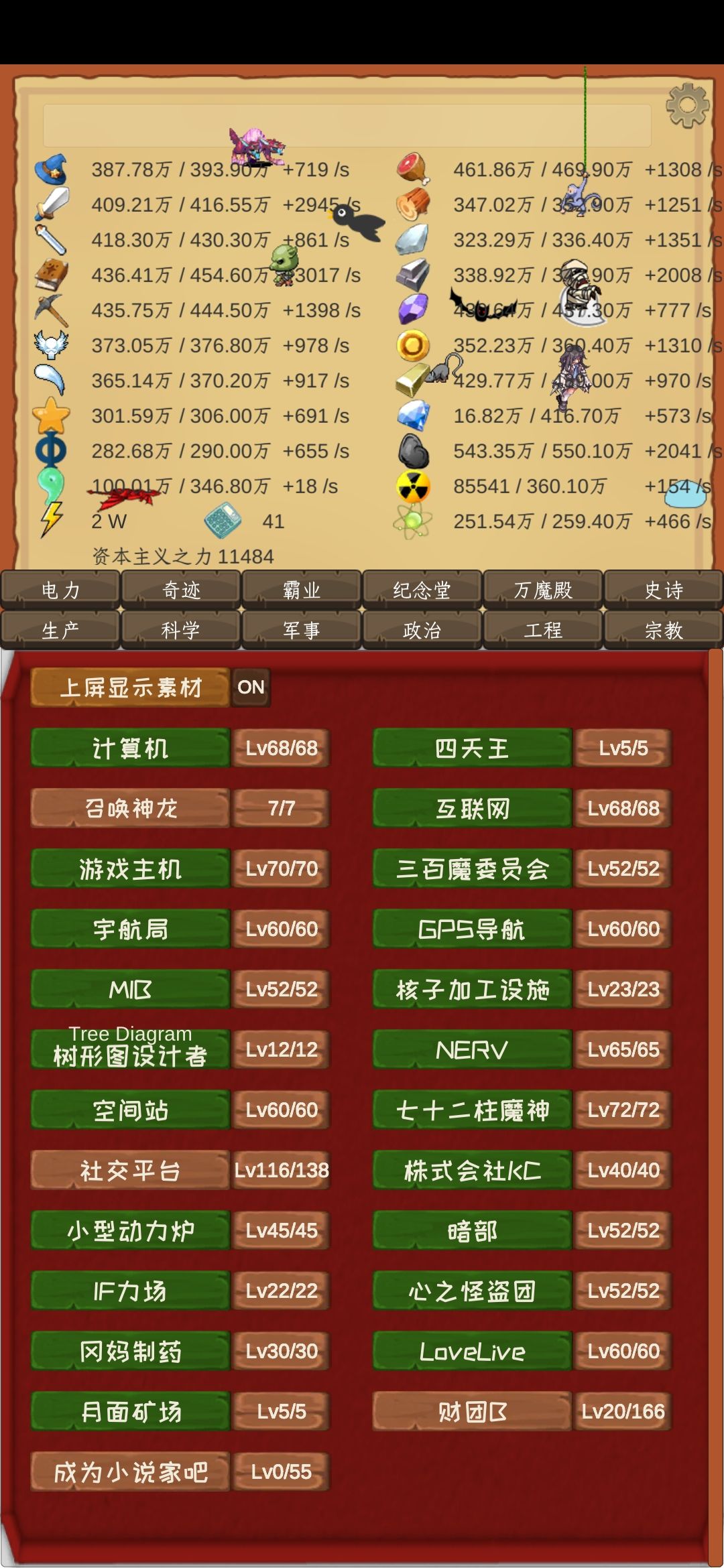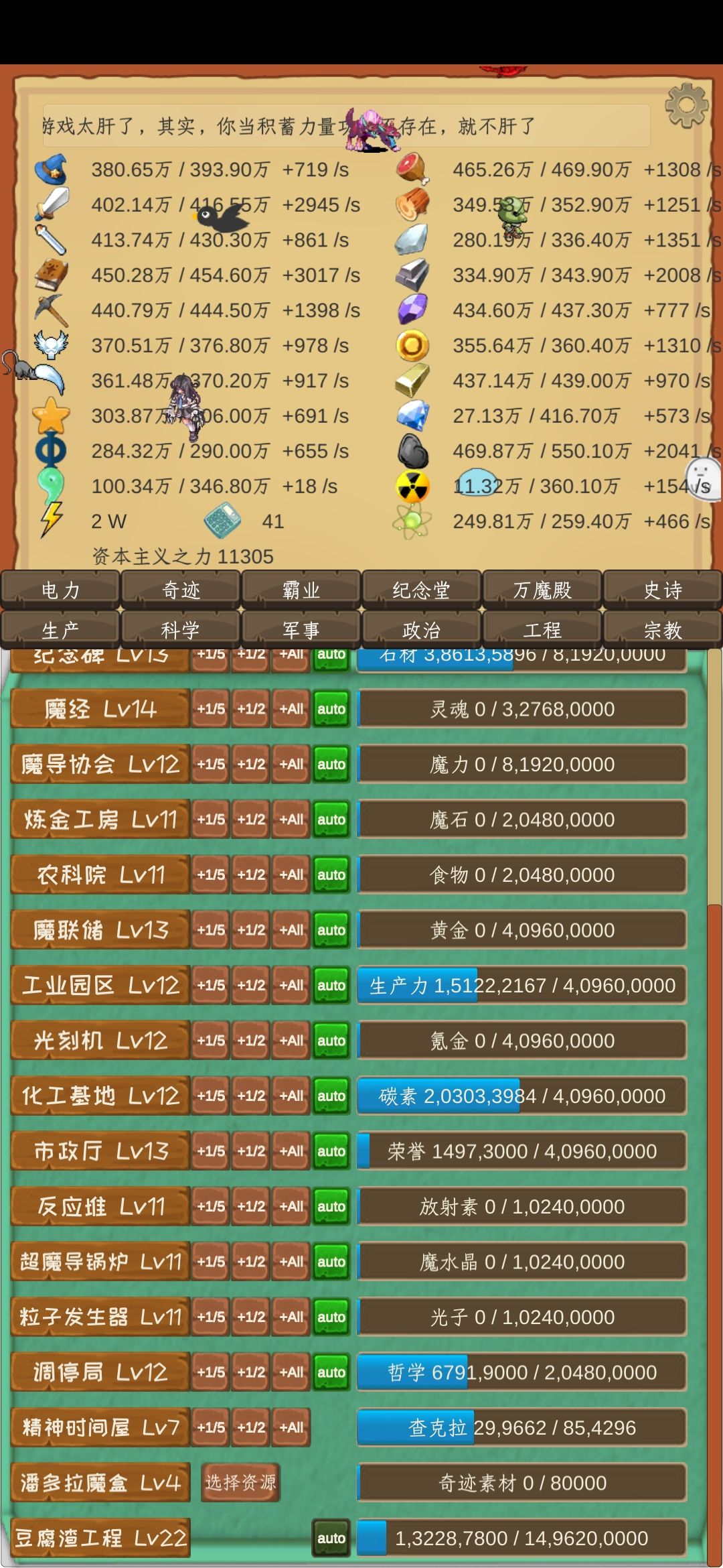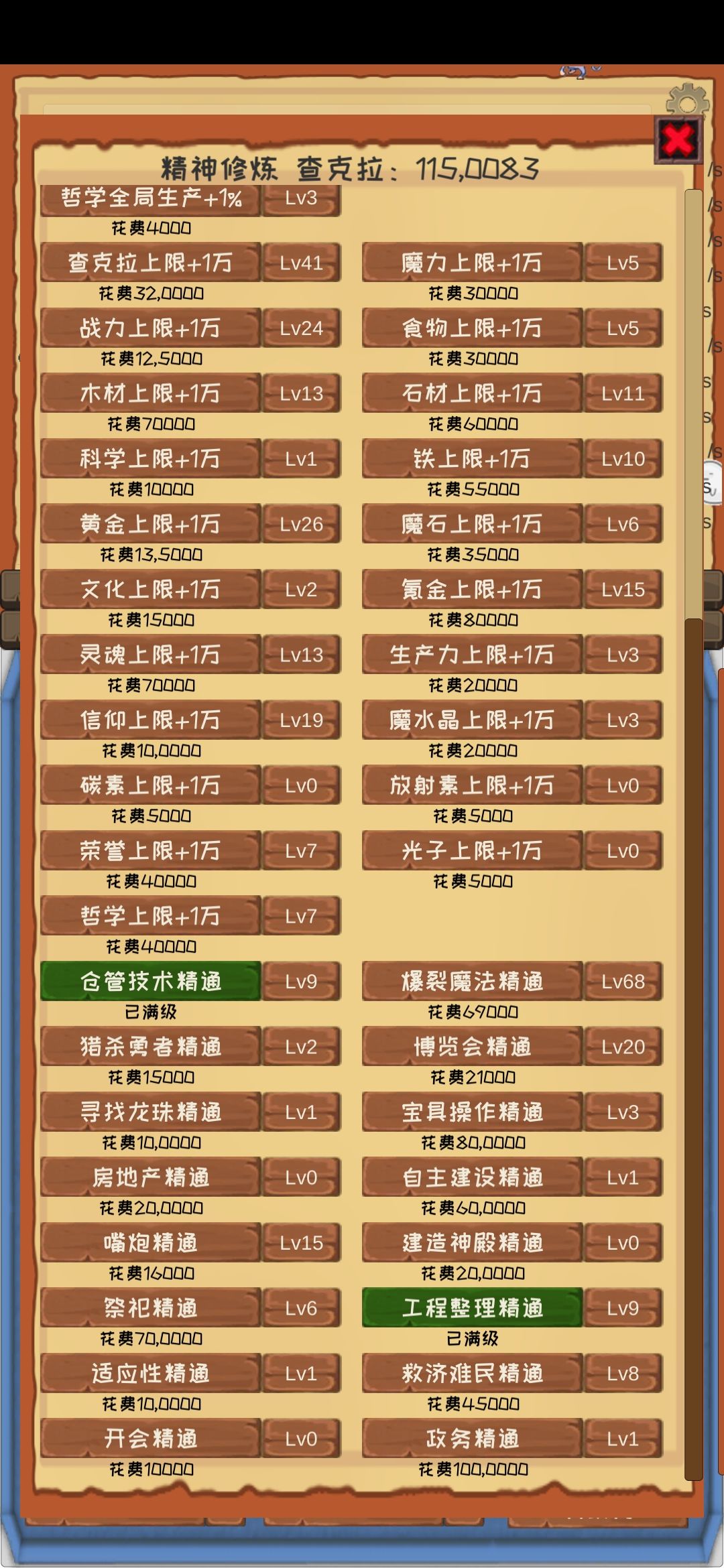 黄金就更离谱,看了大佬的帖子以后晓得了黄金上限最难搞,九个扩建许可里八个是增黄金上限的,结果还是差的远,一次差20万,另一次差50万(跨媒体企划),升满了工程整理还差16万,最后是精神修炼硬怼上限补齐的