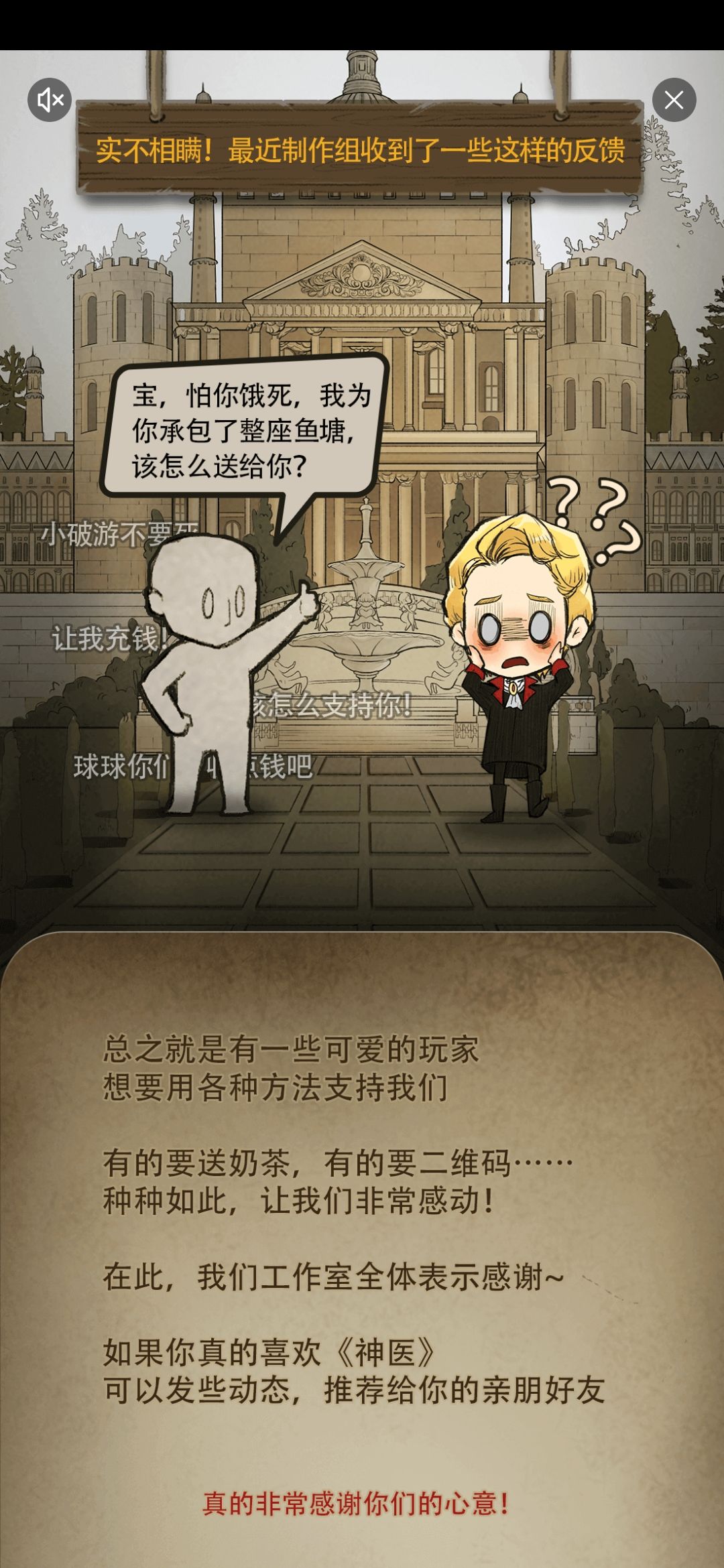 这个游戏的名字也很有内涵 神医 可以是真的那种神医! 也可以是假的那种神医~ 即可以带点嘲讽语气读呵 神医! 又可以用神圣的气息赞美 真乃神医 世人典范!也道进了医学发展的艰辛 这条道路贯穿中西方 连接古往今来 在不同时代都存在着不同的艰辛 不走其路尝不到种种 确实很感慨。