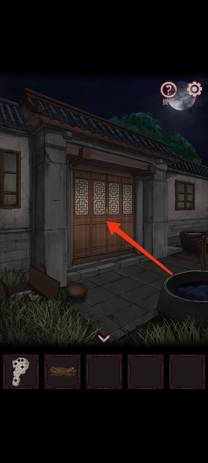 解开小盒子,发现一个坏掉的棋谱纸,先拿着,继续点后院房子,注意看房子上面眼睛👀是解开这个房间锁的关键,锁我已经把正确三个打上去,还有最后一个怕打上去了截不了图,解开锁,不要急着进房间,回到大厅,我画红圈那去亭子吧绳子拿了再进房间,把绳子装在水井,再进房间锁的第三个我弄错了,不是这个,你们自己摸索吧