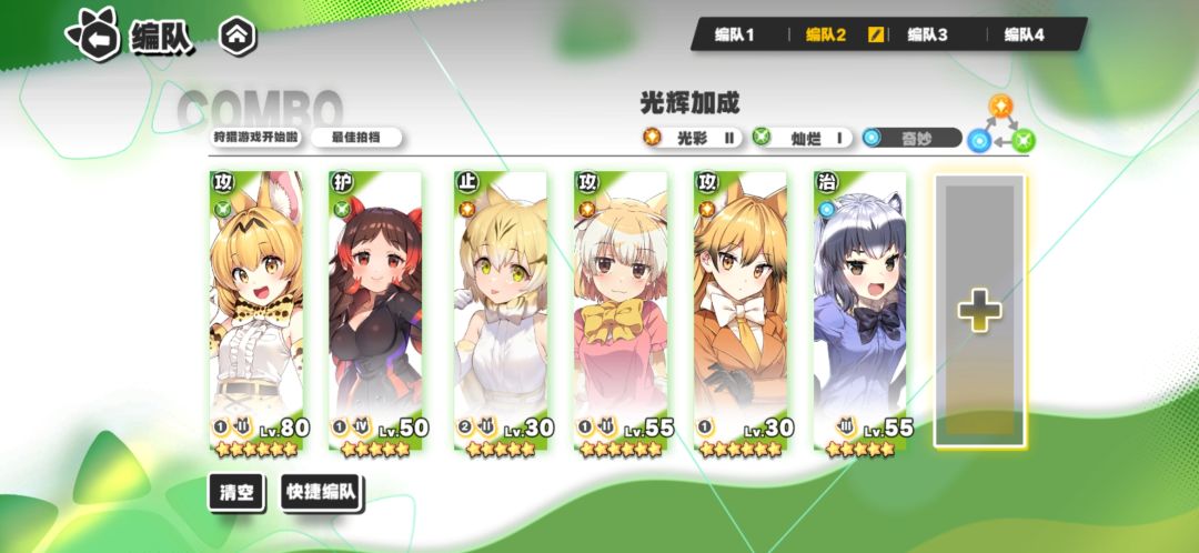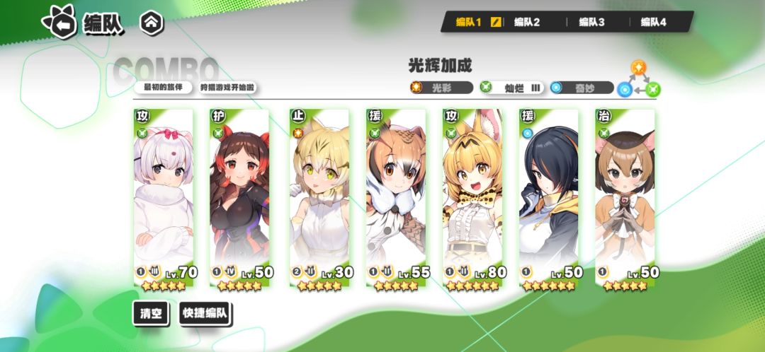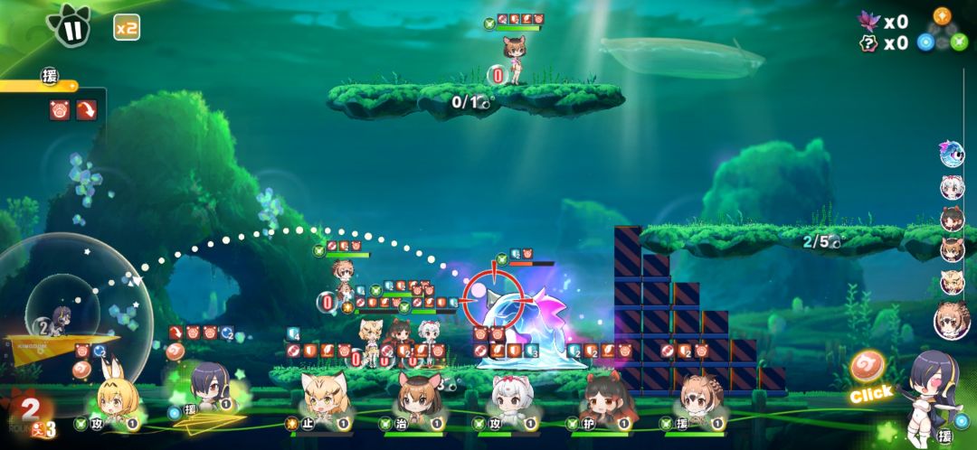 玩法上没有很大改动,依旧是弹射出场,止治功援护五种角色根据地图属性以及怪物种类不同选择合适时机进场,附上通关阵容,伶鼬和薮猫配双buff输出