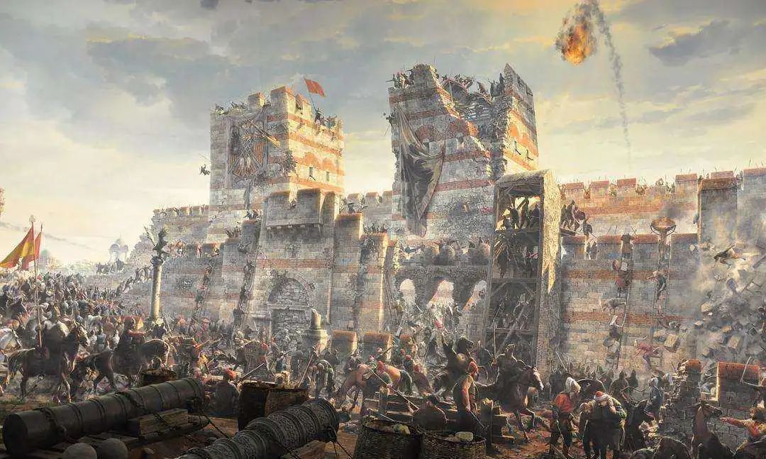 固守坚城的原型是君士坦丁堡战役,发生在公元1453年,奥斯曼土耳其帝国灭亡拜占庭帝国(东罗马帝国)的攻城战。