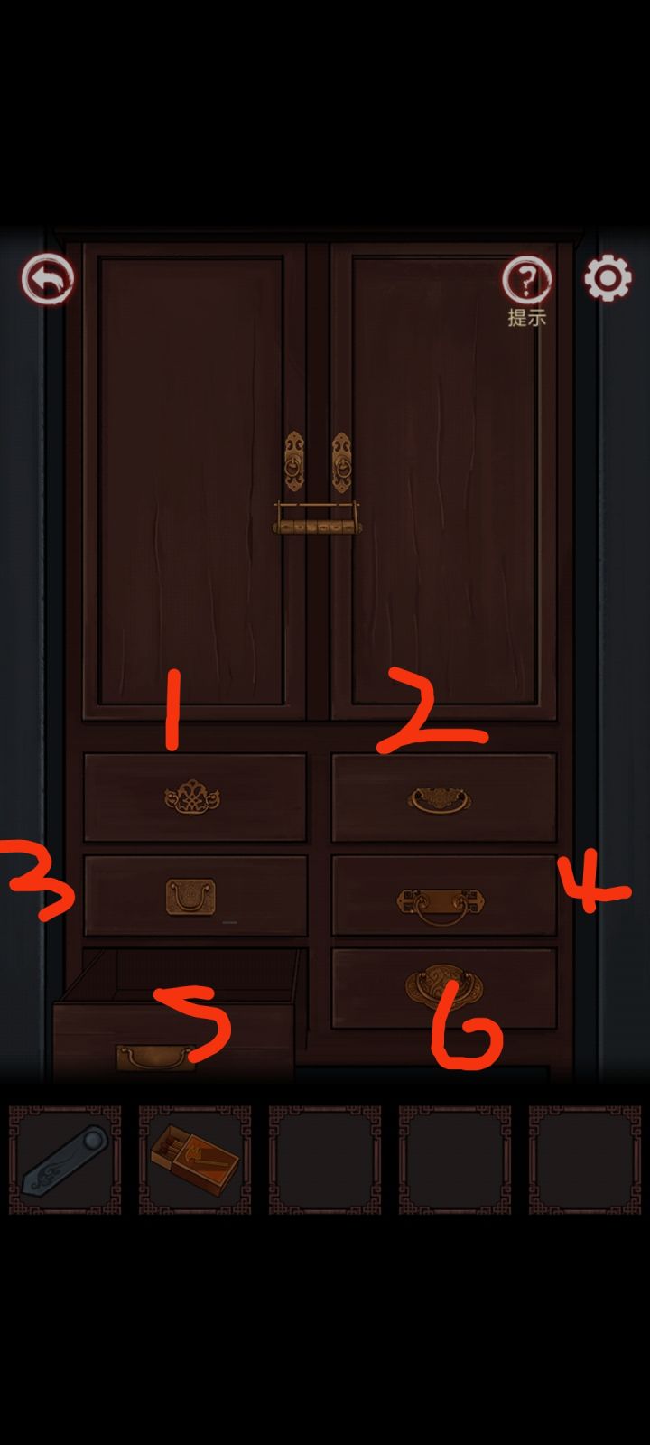 然后点有盖子棺材这边柜子 ,总共有六个抽屉,注意看六个抽屉把手形状不一样,记住它们形状对应抽屉开关顺序,我画箭头填1号柜子,第二个箭头2号柜子,三个箭头3号柜子,四个箭头4号柜子,5个箭头5号柜子