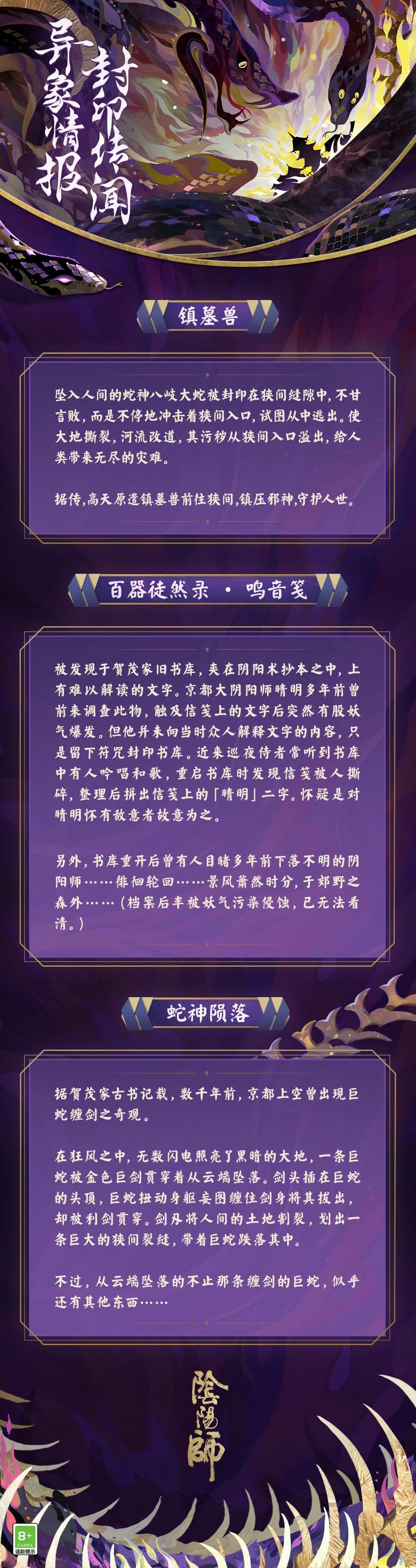 三大阴阳师家族聚于阴阳寮,共议此事——人类若要抗衡邪神,势必需掌握千年前高天原封印邪神的线索。