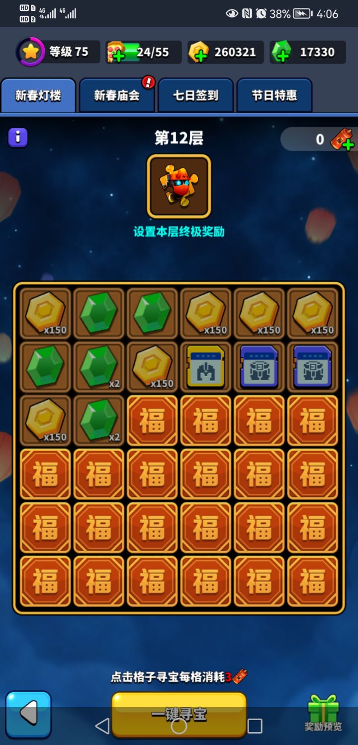这个新年活动有更新么?我领完补偿后还是50关,也不能选技能,体力好贵啊,忍痛玩了。结果最后一关BOSS太强了,满血满盾瞬秒,还有无敌。从地图最上面到最下面我要跑5秒,BOSS只需要1秒不到,这打个啥啊→_→