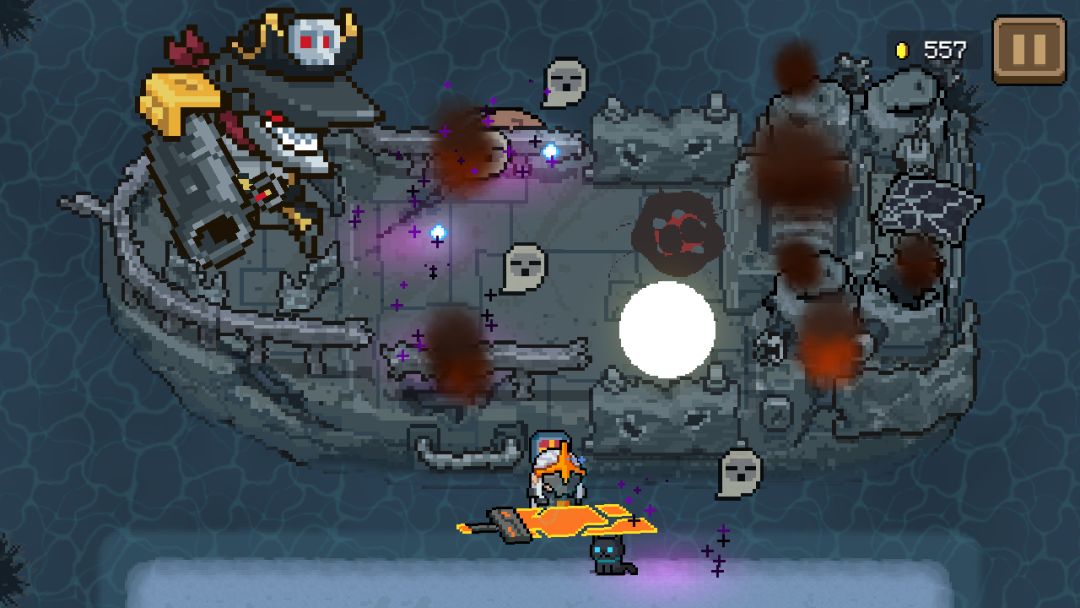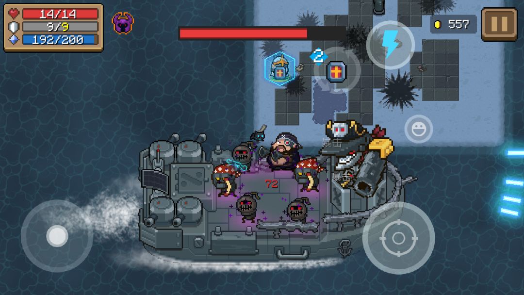 面对这些小怪只需合理运用走位各个击破即可;大王级海盗的炮弹则可以用近战武器打回去(无需近战反弹),但这里的炮弹不会有等待时间,落地即炸。