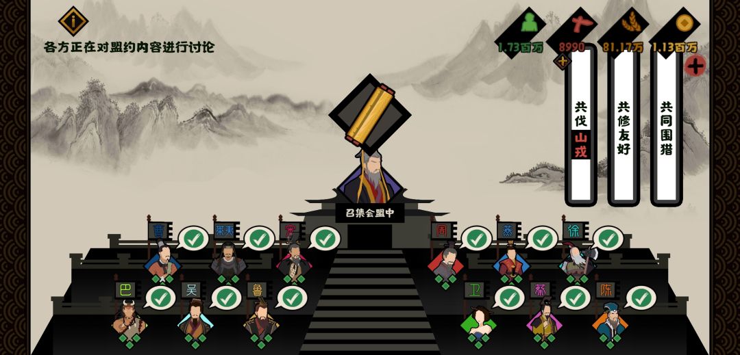 会盟是春秋里面,最核心的一个玩法,间接影响了你这局游戏的走向,在这个时代会盟的国家会特别多,频率特别高,而且共伐盟约比较容易通过,亲身体会被十一国共伐。
