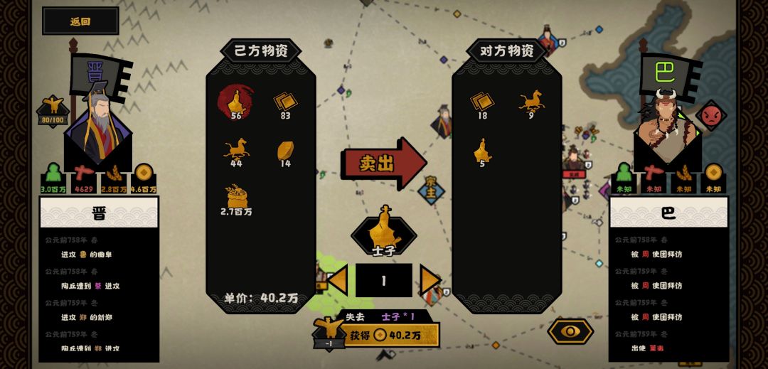 同时我们也可以把多余的或者暂时用不到的资源卖出去换取金钱,粮食不够时,也可以用金钱购买粮食。温馨提示:贸易需要好感度60以上才会开启贸易,低于40会解除贸易。
