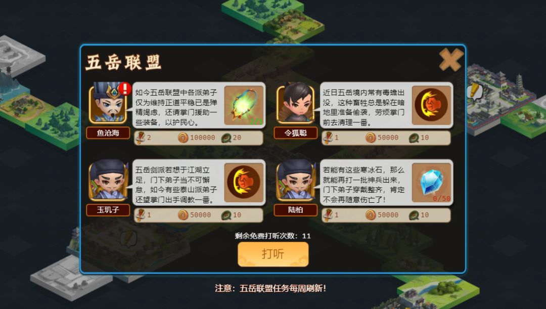 4. 新增【五岳联盟】,联盟将于每周发布联盟任务,完成后可通过【打听】获得更多联盟任务,完成联盟任务可获得道具【五岳剑令】,用于前往各派藏经阁兑换武学秘籍;