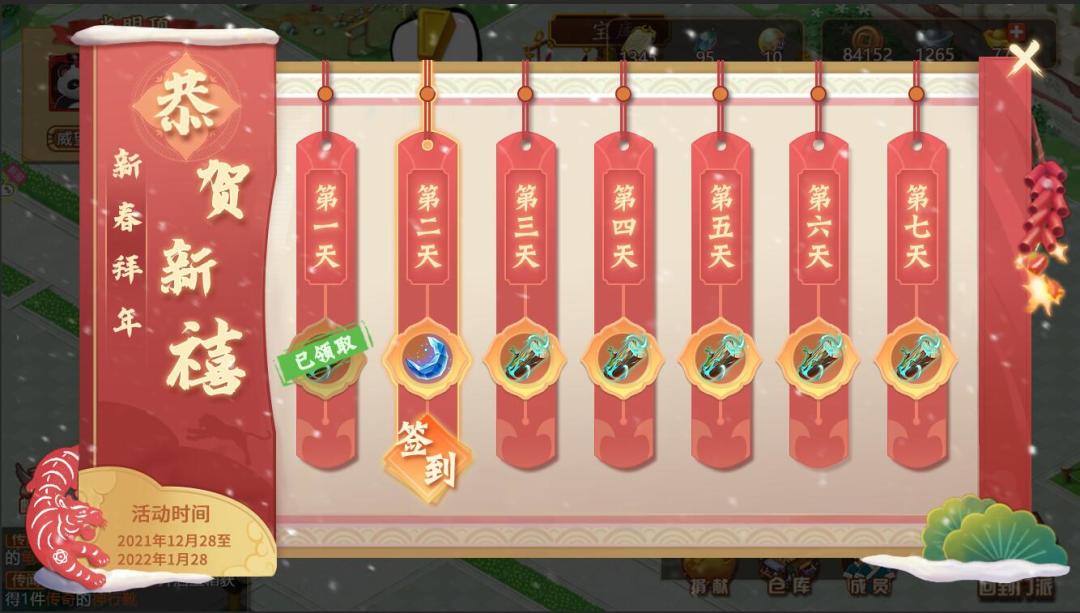 ①开放活动【新年签到】,期间掌门可通过活动界面进入【签到界面】,每日完成签到任务,即可获得各类珍稀道具奖励,不容错过!